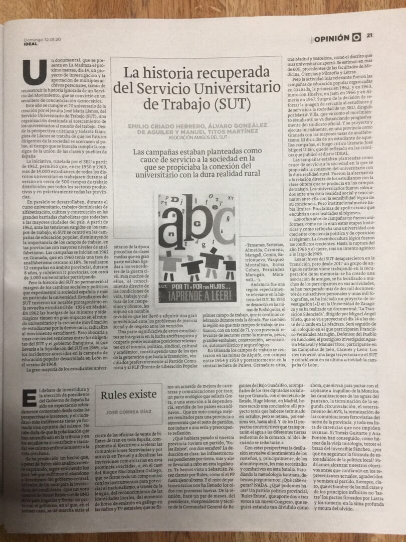 EL SERVICIO UNIVERSITARIO DEL TRABAJO – SUT- FUE CREADO EN MARZO DE 1952, SEGÚN ACUERDO ENTRE JORGE JORDANA FUENTES, DELEGADO NACIONAL DEL SEU, Y EL JESUITA JOSÉ MARÍA LLANOS, QUE IMPULSÓ EL PRIMER CAMPO DE TRABAJO PARA UNIVERSITARIOS EN LAS MINAS DE ORO DE RODALQUILAR (ALMERÍA).